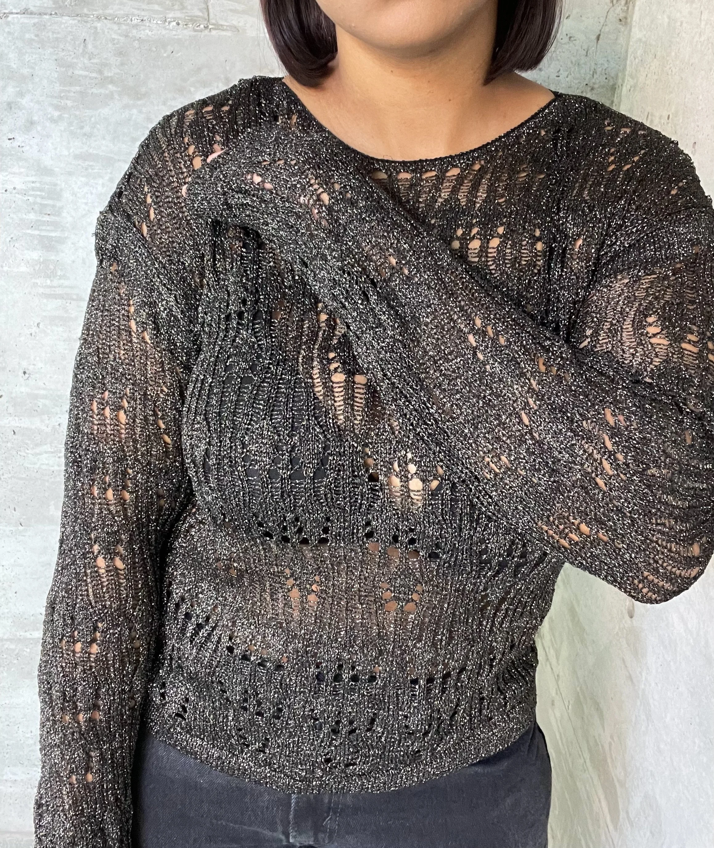 All Electric Jade Cami Stop Meshing Around Sheer Serenity Blouse Ruffle my Feathers Blouse Monica Denim Tube Crop Top Sale Pure Art Puff Sleeve Blouse Ride It Like A Cowgirl Turtle Neck Crème de la Crème Top Sale Count Me In Knitted Top Sale Stand Out Bandanna Halter Top Glitter Yarn Crochet Knit Sweater Off-The-Rack Lurex Knit Blouse Cindy Wrap Bow Tie Button Up Sale Smile For Me White Tee Sale